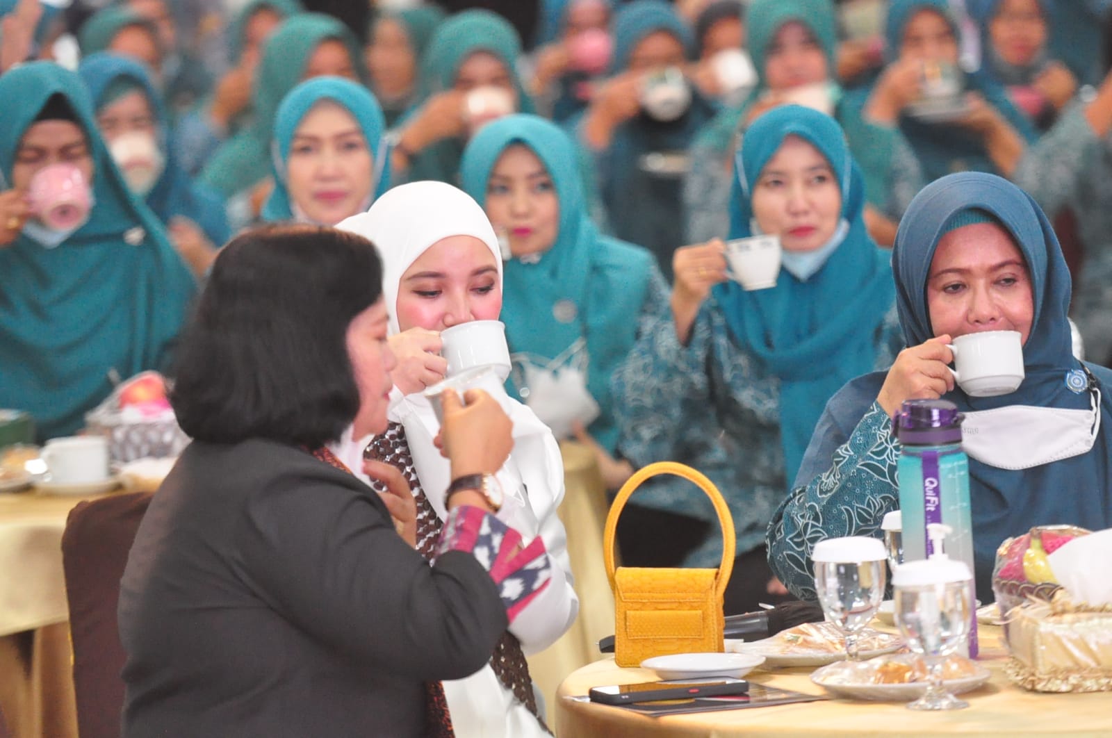 Istri Bupati Kendal, Jawa Tengah, Chacha Frederica (berbusana putih) minum kopi dalam acara 5.555 Perempuan Minum Kopi Bersama di Kendal, Jumat. (Foto: PWI Jateng)