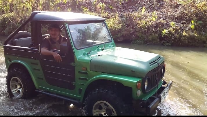Oke, tantangan diterima. Tekan pedal kopling, lepas pelan sambil injak pedal gas. Wow, jip berjuluk jangkrik ijo itu rupanya galak dibawa putar-putar berkecipak air kali. Pelan saja. Maklum ini kali pertama bawa jip. Di kali pula. Air tak terlalu dalam sekitar semata kaki. Batu-batu sekepalan tangan membikin roda beberapa kali selip. Berhasil. Putar, maju, mundur sampai ke seberang.