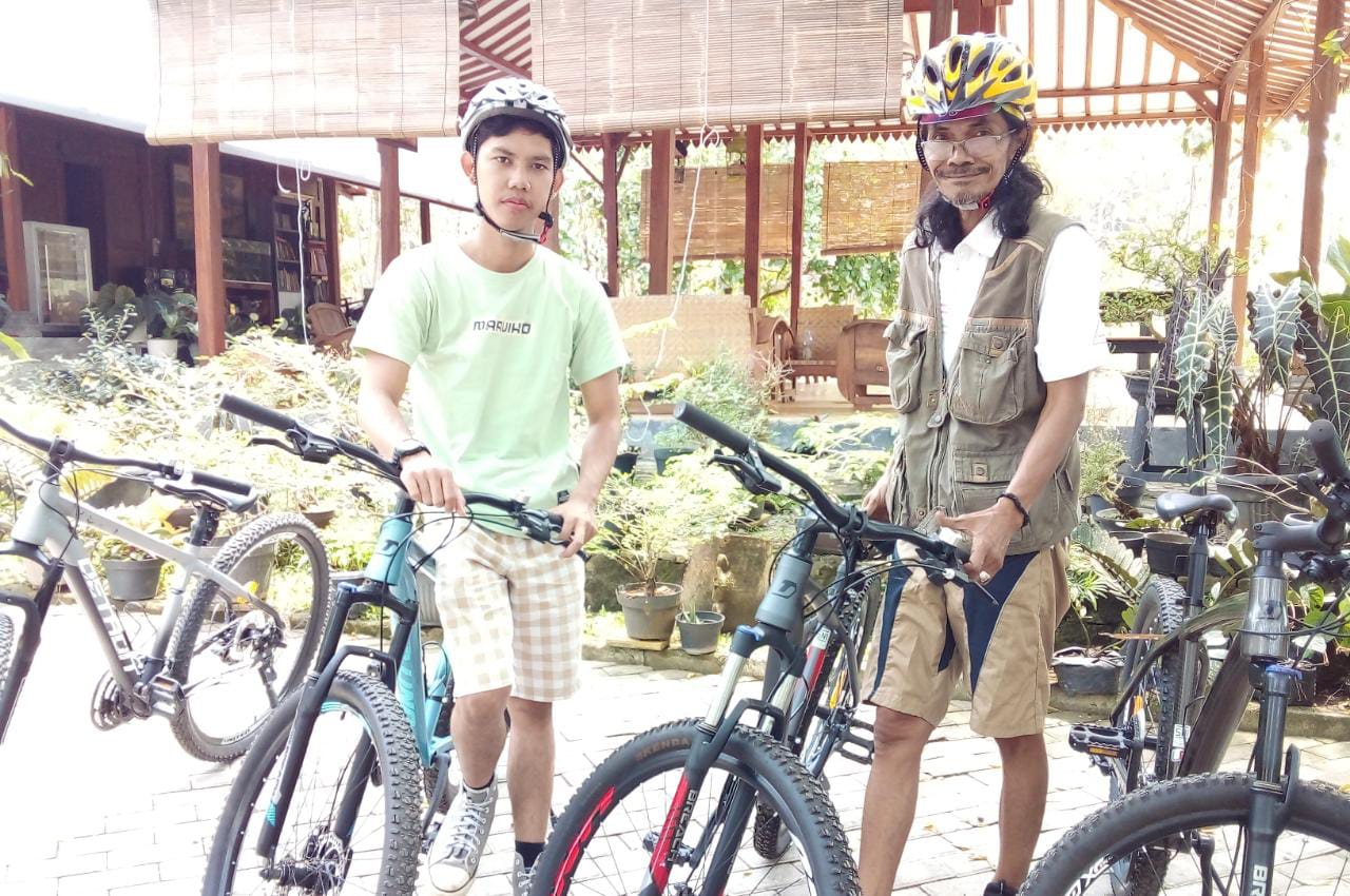 Zaki Daris Arhan(kiri) didampingi Edy Cahyono. Zaki berkunjung ke basecamp Komunitas Wisata Hijau Lestari Karangwetan Salamrejo dan memilih sepeda MTB buat jalan-jalan ke sentra anyaman serat alam. (Foto: Wiradesa.co)