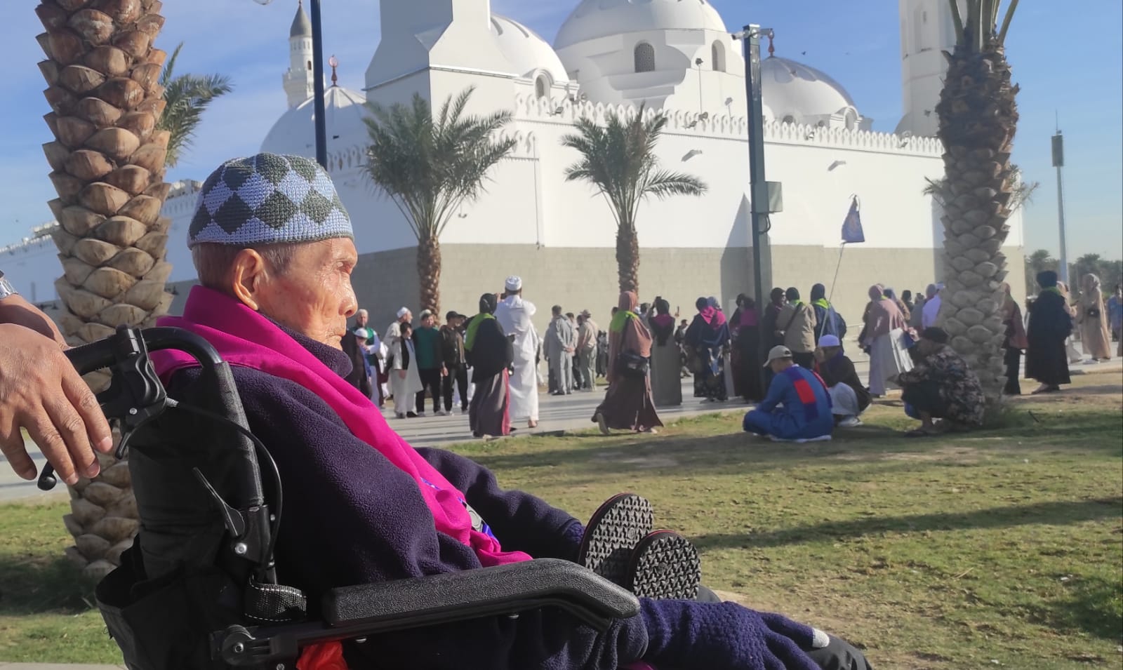 Mbah Dirjo di Masjid Quba’ dengan kursi roda barunya. (Foto: Wiradesa)