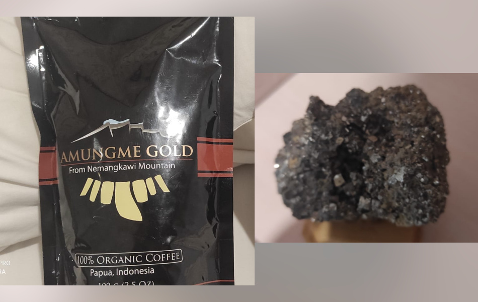 Ada dua cinderamata yang diterima wartawan Wiradesa Group saat berkunjung ke Mimika, Papua Tengah, 12-16 Desember 2023. Dua barang berharga ini, kopi Amungme dari pegunungan Nemangkawi dan bongkahan batu mengandung mineral permata dari Grasberg, Tembagapura, Mimika.