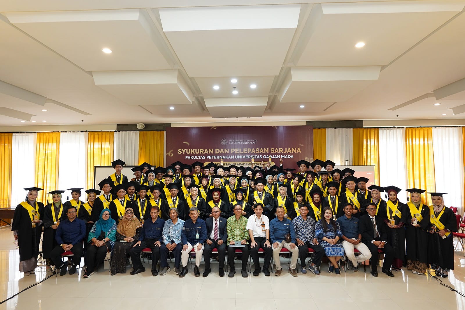 Dekan Fakultas Peternakan (Fapet) UGM, Prof. Ir. Budi Guntoro, S.Pt., M.Sc., Ph.D., IPU., ASEAN Eng., mendorong para wisudawan dan wisudawati Fapet UGM untuk mengawal program pemerintah di bidang pangan. Hal ini ditegaskan oleh Dekan saat melepas para wisudawan Sarjana dan Sarjana Terapan di Hall ASLC Fapet UGM, Rabu (28/5).