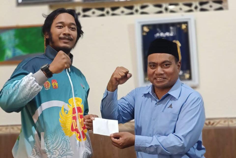 Atlet taekwondo DIY Dimas Bagas Prabandaru Wijayatmaka yang akan berlaga pada PON XXI Aceh-Sumut berpamitan dan mohon doa restu kepada Lurah Condongcatur Reno Candra Sangaji. Dimas warga Condongcatur dan tinggal di Jurugsari Padukuhan Joho. (Foto: Istimewa)