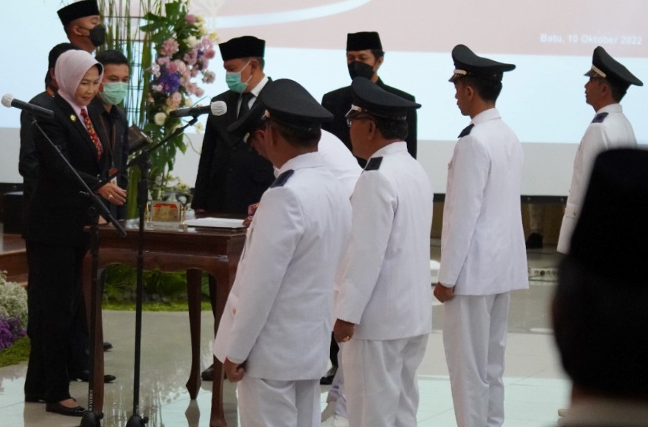 Walikota Batu Hj. Dewanti Rumpoko, melantik lima kepala desa terpilih di Graha Pancasila Balai Kota Among Tani, Senin 10 Oktober 2022. Kelima kades laki-laki ini merupakan hasil dari pilkades serentak yang digelar pada 28 Agustus 2022.