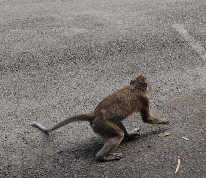 Kera Ekor panjang yang turun dari lereng Gunung Merapi ke halaman parkir obyek wisata Kaliurang, Minggu (22/1/2023). (Foto: Wiradesa)