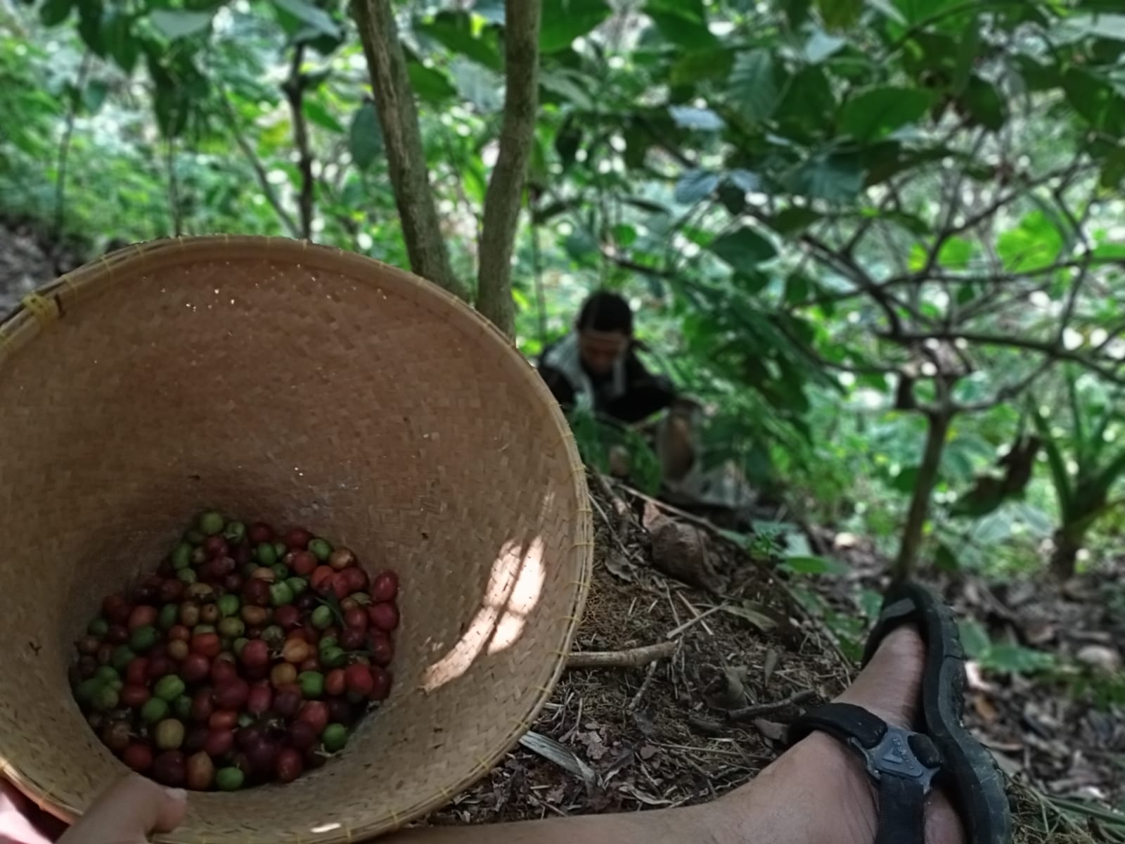 Proses memetik kopi ternyata juga tidak mudah dan harus dilakukan dengan ekstra hati-hati. Pohon-pohon kopi ditanam di lereng dengan kemiringan yang tajam. Bahkan di beberapa titik, lahannya sangat sempit. Salah melangkah sedikit saja dapat berakibat fatal, langsung tergelincir ke dalam jurang yang menurut warga masih menjadi sarang macan Muria.