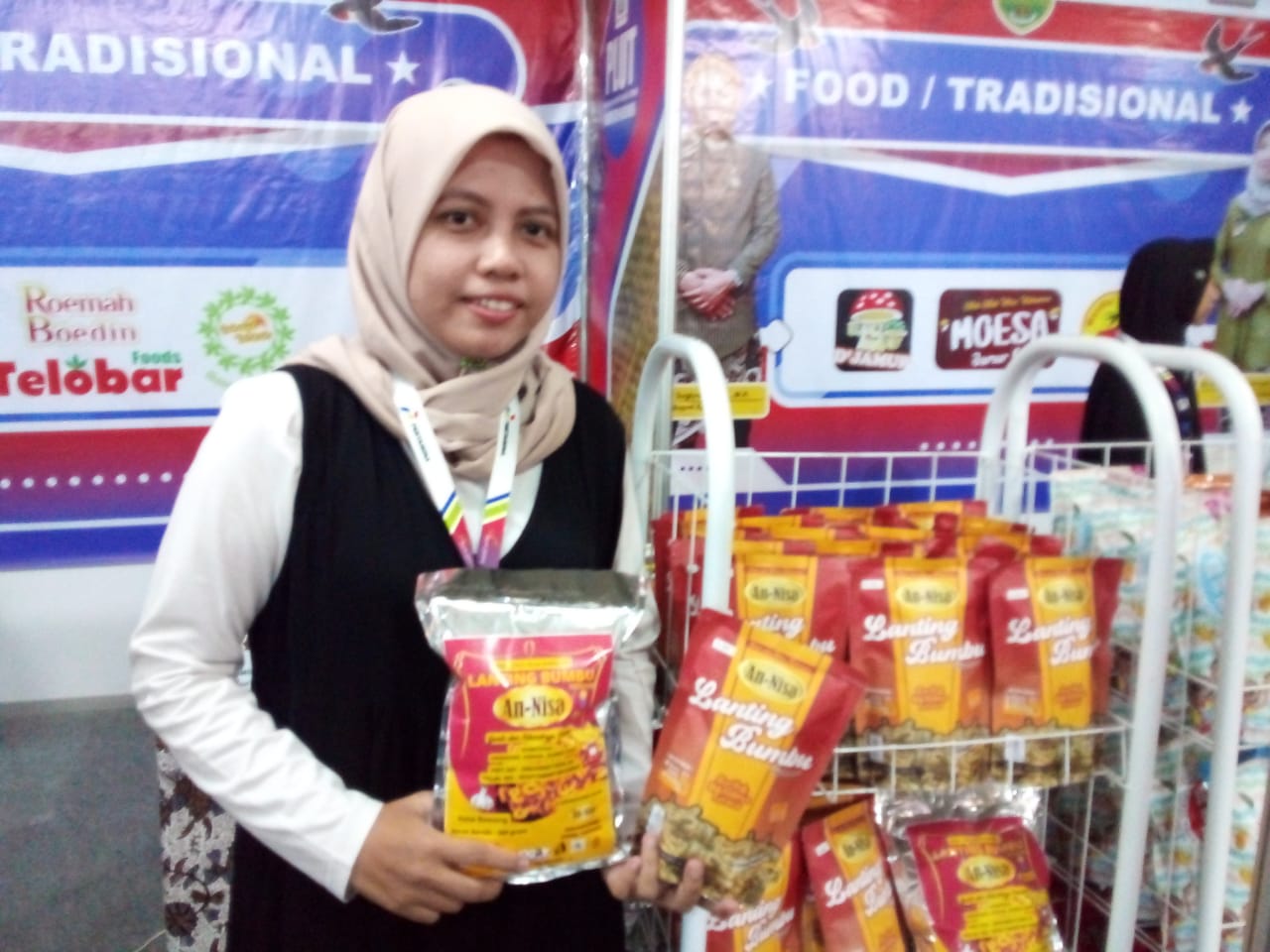 Verayanti Septiani, produsen lanting bumbu khas Kebumen menunjukkan produknya dalam kemasan alumunium foil di arena Kebumen International Expo 2023, Kamis (22/6). (Foto: Wiradesa)