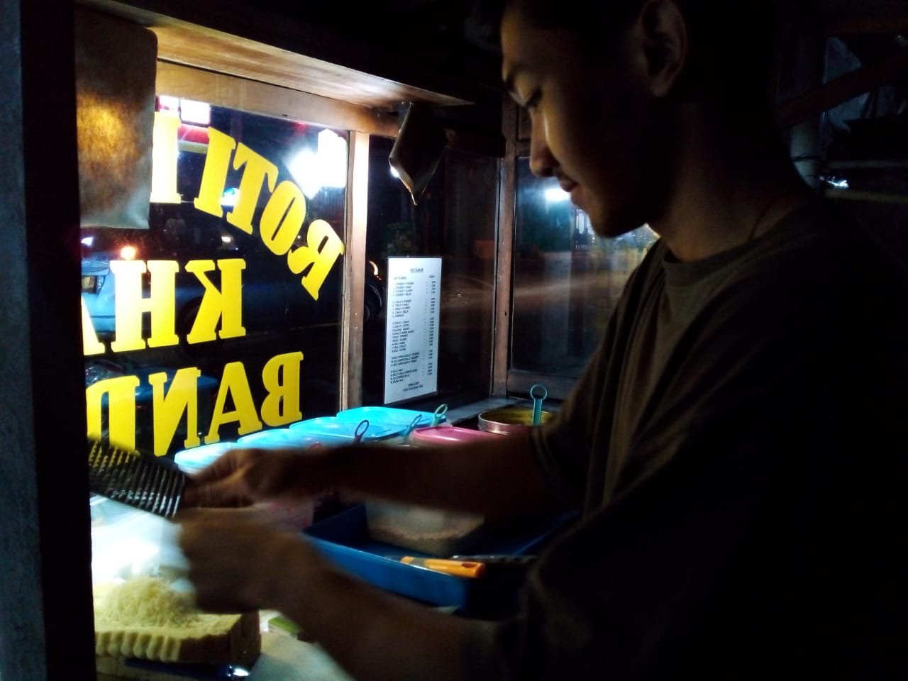 Priyo, mengoles roti dengan susu kental manis, taburan kacang dan keju pesanan pembeli. (Foto: Wiradesa).