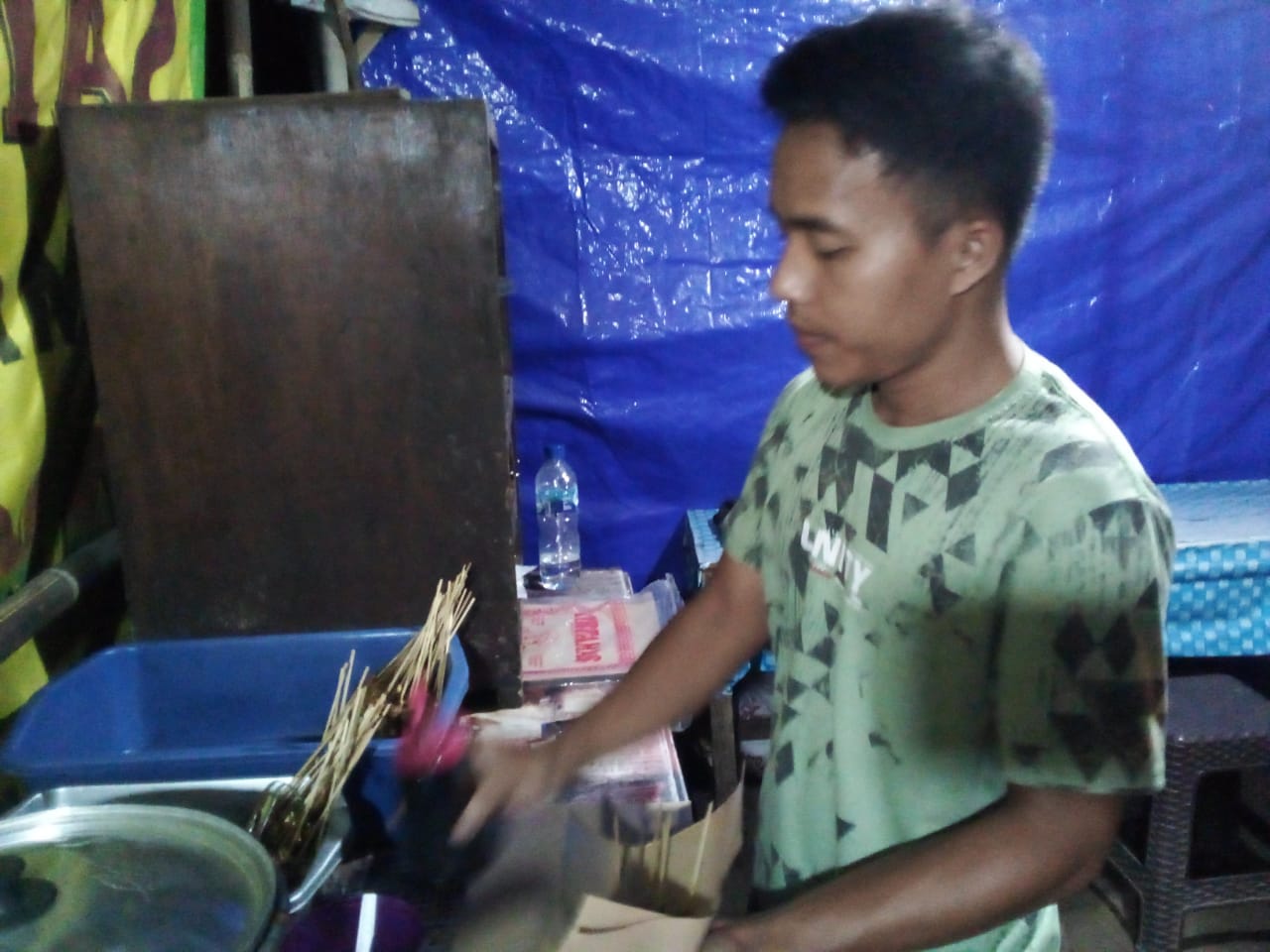 Sofyan, membungkus pesanan sate ayam Madura. (Foto: Wiradesa)