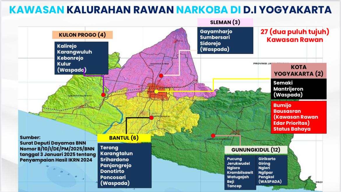 Perlu diketahui, sesuai data BNNP DIY berdasarkan Surat Deputi Dayamas BNN nomor B/10/I/DE/PM/2025/BNN tanggal 3 Januari 2025 tentang penyampaian hasil IKRN 2024 berikut Kawasan Kalurahan Rawan Narkoba Di DIY untuk Kabupaten Kulonprogo ada 4 yaitu di Kalurahan Kalirejo, Karangwuluh, Kebonrejo dan Kulur (waspada). Kabupaten Sleman ada 3 yaitu Kalurahan Gayamharjo, Sumbersari dan Siderejo (waspada). Kabupaten Gunungkidul ada 12 yaitu Kalurahan Pucung, Jerukwudel, Ngloro, Krambilsawit, Watugajah, Beji, Tancep, Girikarto, Giring, Ngleri, Nglipar dan Pengkol (waspada). Kabupaten Bantul ada 6 yaitu Kalurahan Terong, Karangtalun, Srihardono, Panjangrejo, Donotirto dan Poncosari (waspada) dan terakhir Kota Yogyakarta Kelurahan Semaki dan Mantrijeron (waspada) sedangkan Kalurahan Bumijo dan Bausasran (kawasan rawan edar prioritas) status bahaya.