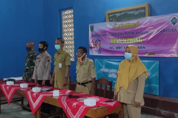 KEBUMEN – Pemerintah Desa Winong menyelenggarakan kegiatan Sosialisasi Bahaya Narkoba dan Pencegahan HIV/AIDS. Acara bareng dengan kegiatan KKN mahasiswa UNS diselenggarakan di Gedung Serba Guna Desa Winong, Mirit, Kebumen.