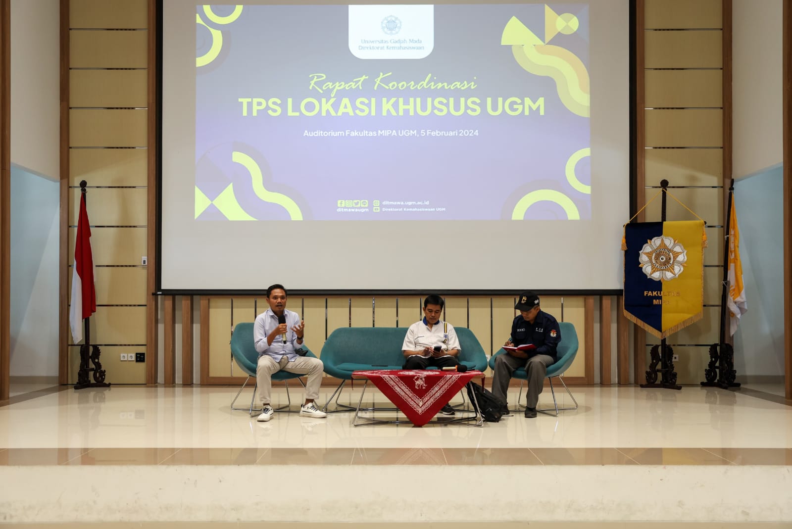 Dalam pelaksanaaan pemilu 2024 ini, UGM turut berpartisipasi menyukseskan jalannya pesta demokrasi akbar ini dengan memfasilitasi mahasiswa dari luar daerah untuk dapat menggunakan hak pilihnya dalam pemilu 2024 dengan menyediakan sembilan TPS khusus. Sembilan TPS khusus tersebut tersebar di lima lokasi di UGM dan tercatat ada sebanyak 2.611 orang calon pemilih mahasiswa yang akan menggunakan hak pilihnya di TPS khusus UGM. Melibatkan pula 36 pengawas independen dan 63 KPPS dari kalangan mahasiswa UGM, serta linmas dari Kalurahan Caturtunggal, Sleman.
