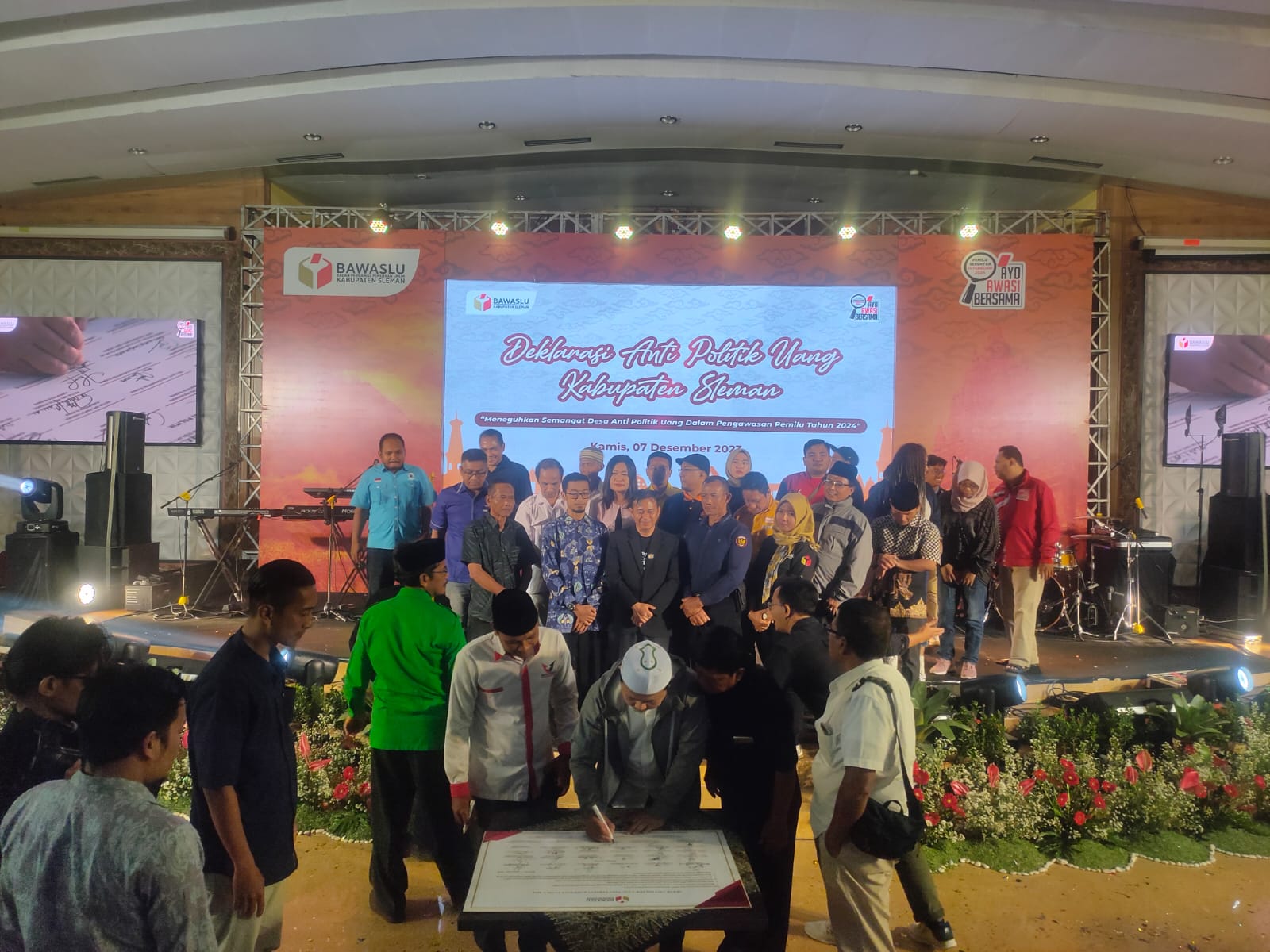 Perwakilan partai politik, calon DPD dan perwakilan dari desa anti politik uang melakukan penandatanganan deklarasi menolak politik uang. (Foto: Wiradesa)