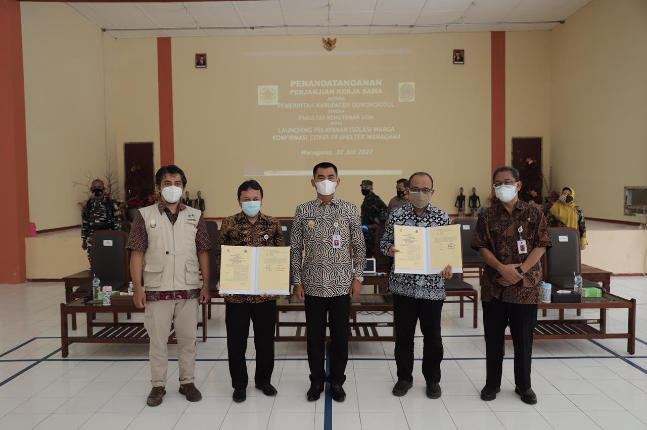 GUNUNGKIDUL – UGM menambah fasilitas selter penanganan Covid-19 yang diperuntukkan bagi pasien konfirmasi bergejala ringan. Rumah peneliti Wanagama UGM mulai difungsikan sebagai selter dengan ditandatanganinya Perjanjian Kerja Sama antara Pemerintah Kabupaten Gunungkidul dan Fakultas Kehutanan UGM, Jumat 30 Juli 2021.