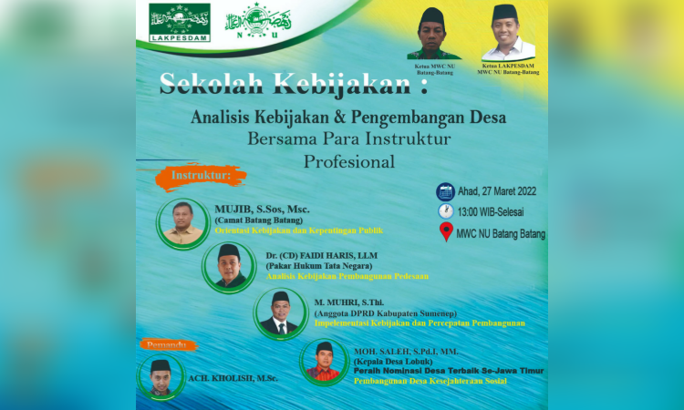 Ketua MWC NU Batang-batang, Masyuri menerangkan bahwa Sekolah Kebijakan akan dilaksanakan pada Minggu, 27 Maret 2022, di aula MWC NU Batang-batang, Sumenep. Dengan menghadirkan empat narasumber, di antaranya Mujib, SSos Msc (Camat Batang-batang), Dr (CD) Faidi Haris, LLM (Pakar Hukum Tata Negara), M Muhri SThi (Anggota DPRD Kabupaten Sumenep dan Ketua Fraksi PKB), dan Moh Saleh, SPdI MM (Kepala Desa Lobuk).