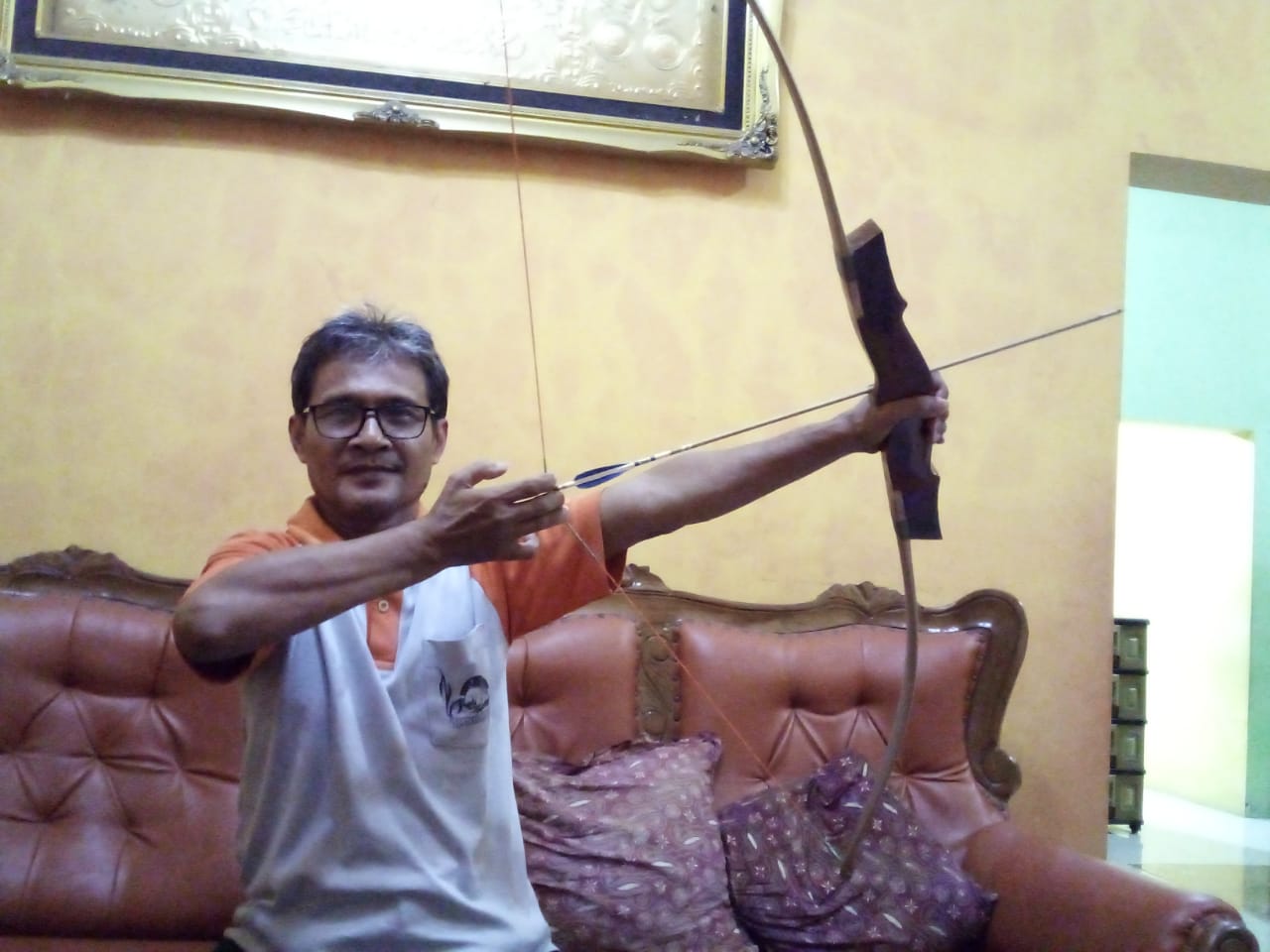 Sugiyarto menunjukkan cara memegang gendewa dan menarik anak panah pada jemparingan. (Foto: Wiradesa)