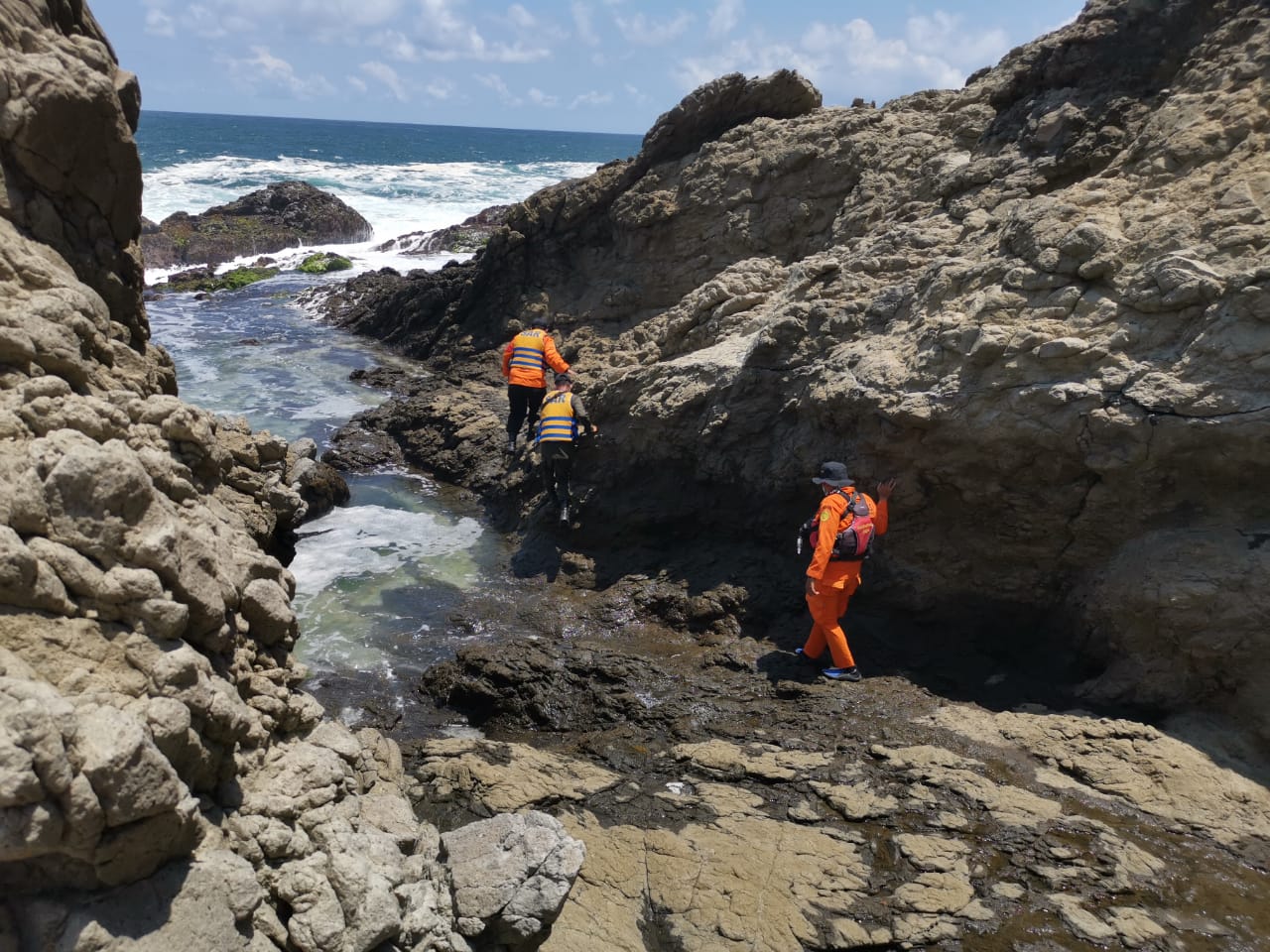 Satu Tim Rescue dari Pos Basarnas Gunungkidul dengan peralatan water rescue memulai pencarian bersama SAR Gabungan yang sudah berada di lokasi. Humas Kantor Basarnas Yogyakarta Pipit Eriyanto menyatakan pencarian dilakukan menggunakan perahu jukung milik SAR Linmas Wilayah 1 Sadeng disertai pemantauan dari atas tebing di samping menyisir Pantai Jungwok. Namun hingga petang pencarian terhadap warga Punukan RT 002 RW 001, Wates, Kulonprogo belum membuahkan hasil.