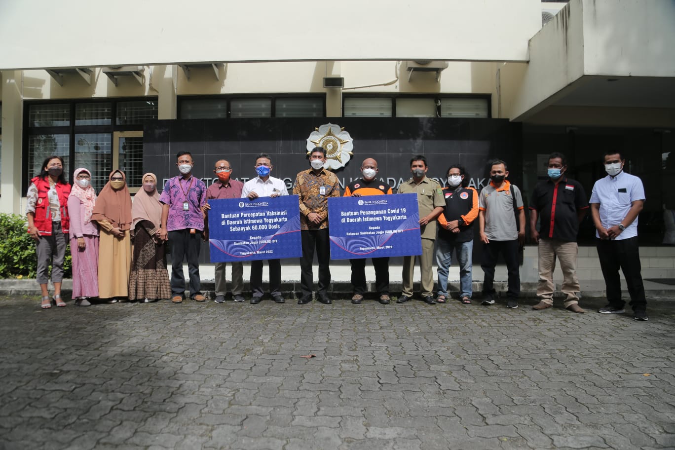 Bantuan diserahkan secara simbolis oleh Kepala Perwakilan BI DIY, Budiharto Setyawan, kepada Ketua Sonjo (Sambatan Jogja), Rimawan Pradiptyo, Senin 7 Maret 2022 di Yogyakarta. Sonjo merupakan gerakan kemanusiaan yang fokus pada upaya membantu masyarakat yang rentan terdampak risiko penyebaran Covid-19.