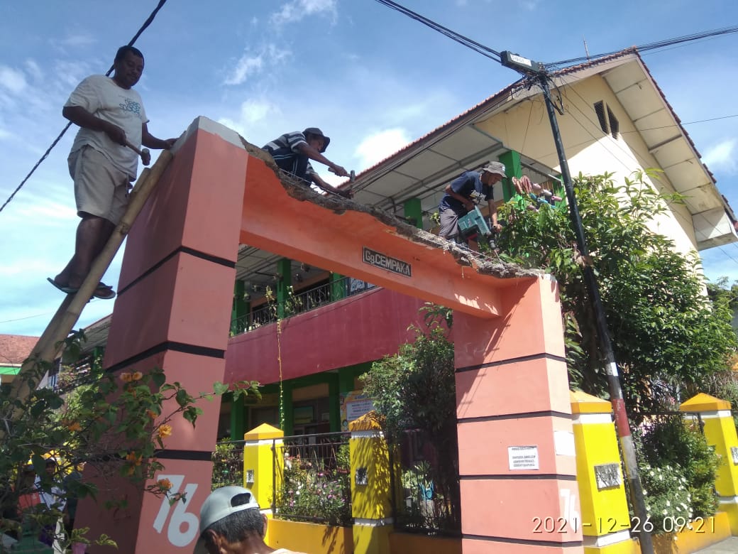 Pembongkaran dilakukan oleh warga dua RW, karena gapura Gang Cempaka bersebelahan dengan RW 04 dan RW 03. Dengan adanya pembongkaran gapura Gang Cempaka, akses keluar masuk gang sempat dialihkan. (Nur Anggraeni)